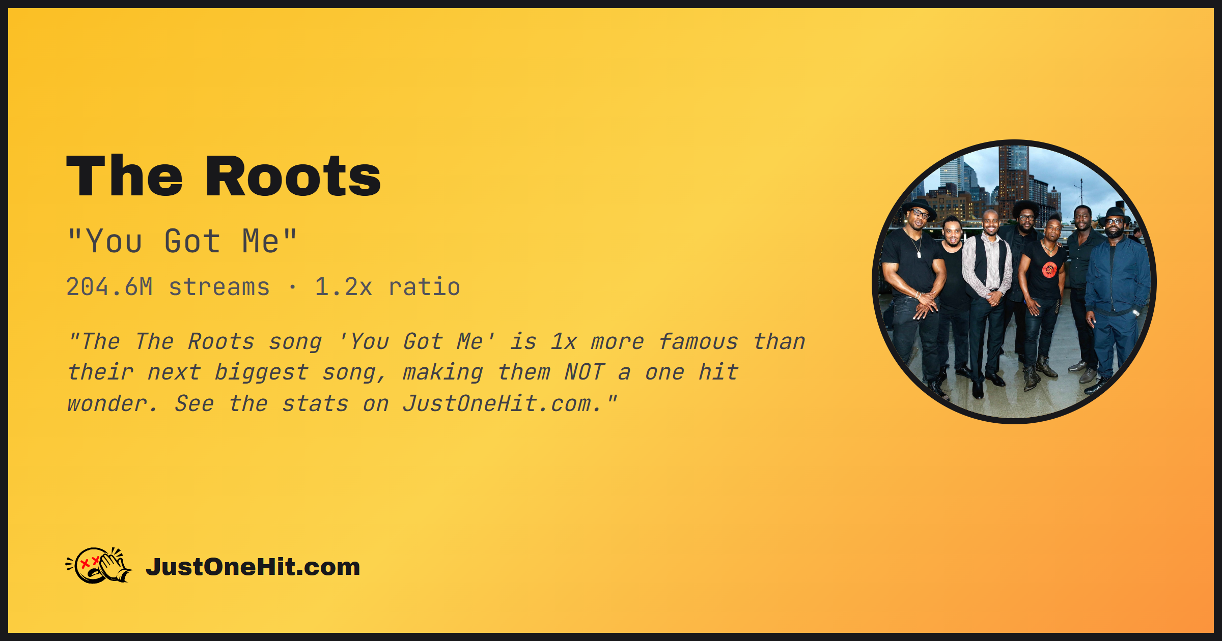 "The The Roots song 'You Got Me' is 1x more famous than their next biggest song, making them NOT a one hit wonder. See the stats on JustOneHit.com."