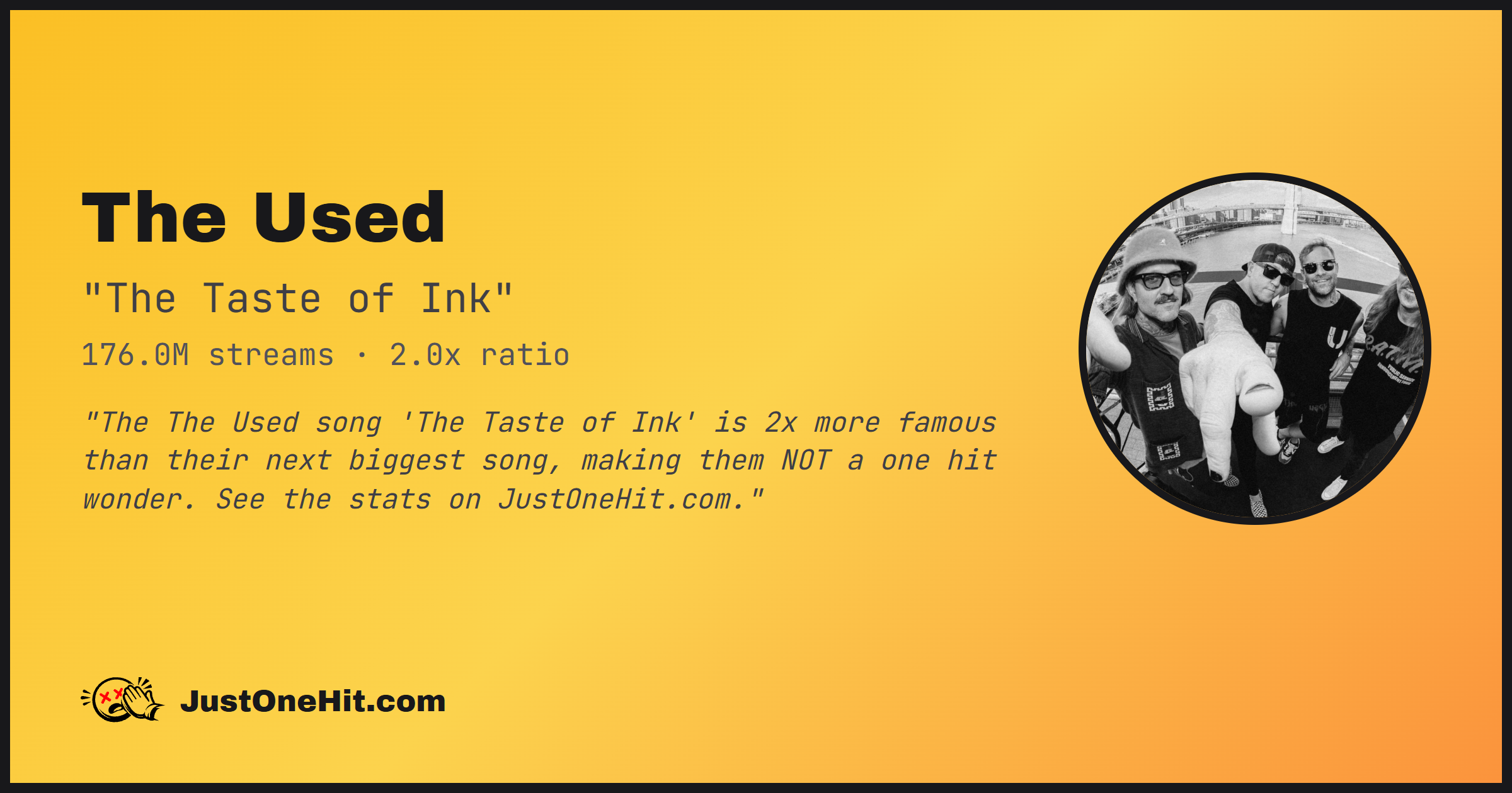 "The The Used song 'The Taste of Ink' is 2x more famous than their next biggest song, making them NOT a one hit wonder. See the stats on JustOneHit.com."