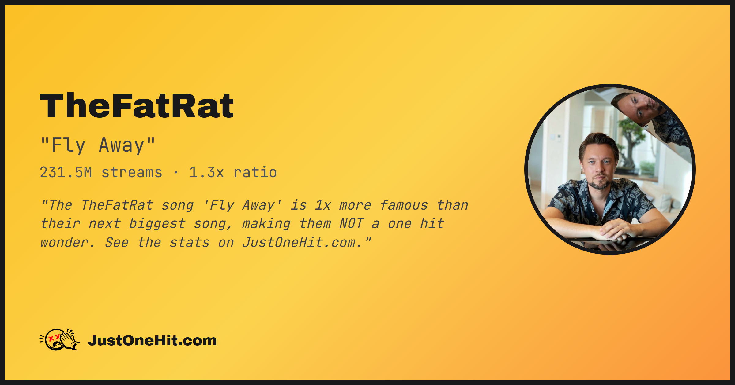 "The TheFatRat song 'Fly Away' is 1x more famous than their next biggest song, making them NOT a one hit wonder. See the stats on JustOneHit.com."