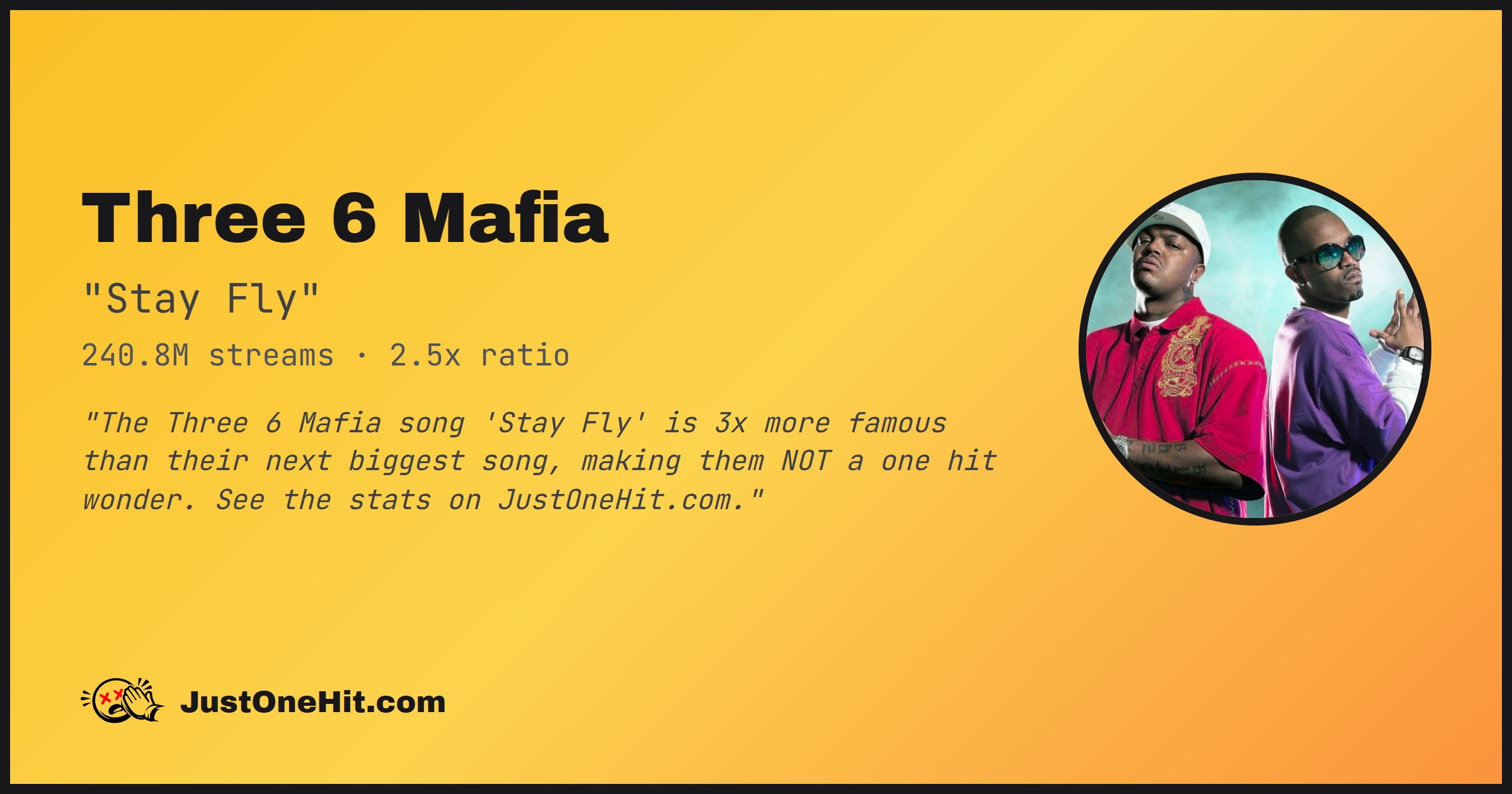 "The Three 6 Mafia song 'Stay Fly' is 2x more famous than their next biggest song, making them NOT a one hit wonder. See the stats on JustOneHit.com."