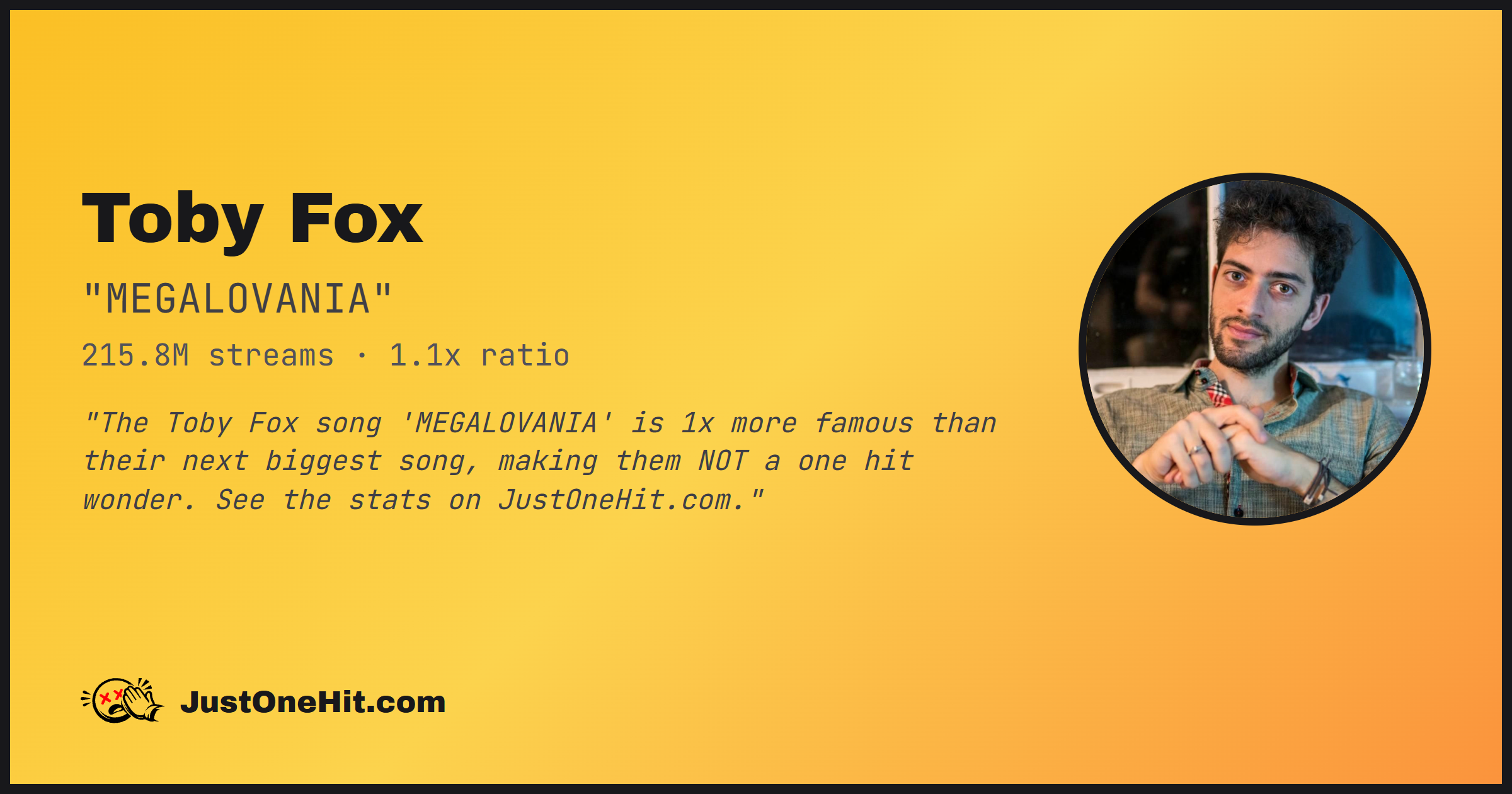 "The Toby Fox song 'MEGALOVANIA' is 1x more famous than their next biggest song, making them NOT a one hit wonder. See the stats on JustOneHit.com."