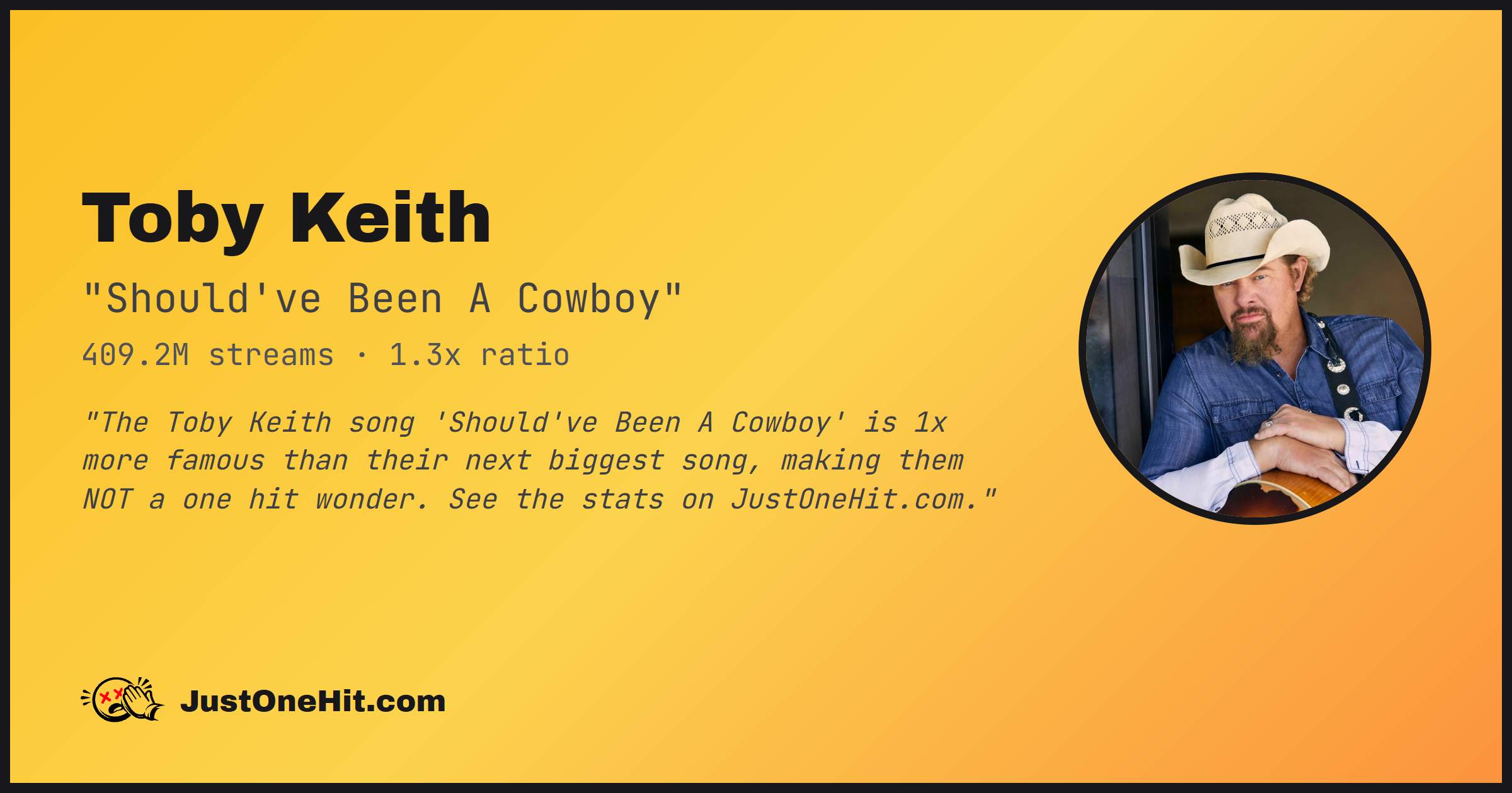 "The Toby Keith song 'Should've Been A Cowboy' is 1x more famous than their next biggest song, making them NOT a one hit wonder. See the stats on JustOneHit.com."