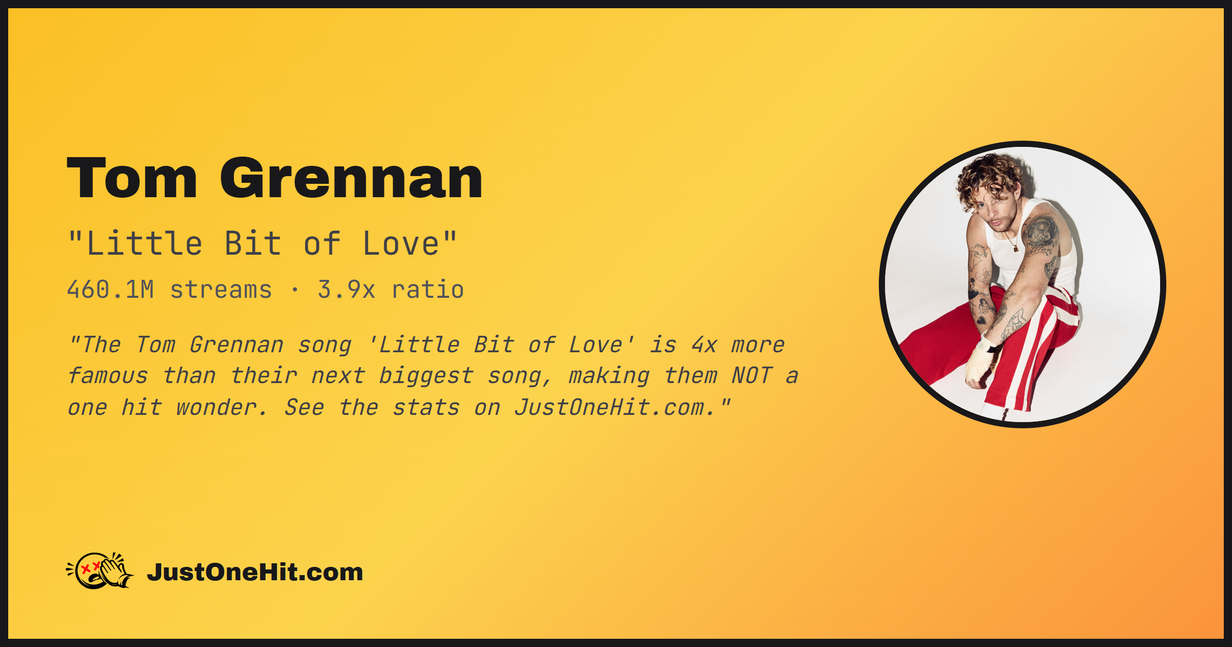 "The Tom Grennan song 'Little Bit of Love' is 4x more famous than their next biggest song, making them NOT a one hit wonder. See the stats on JustOneHit.com."