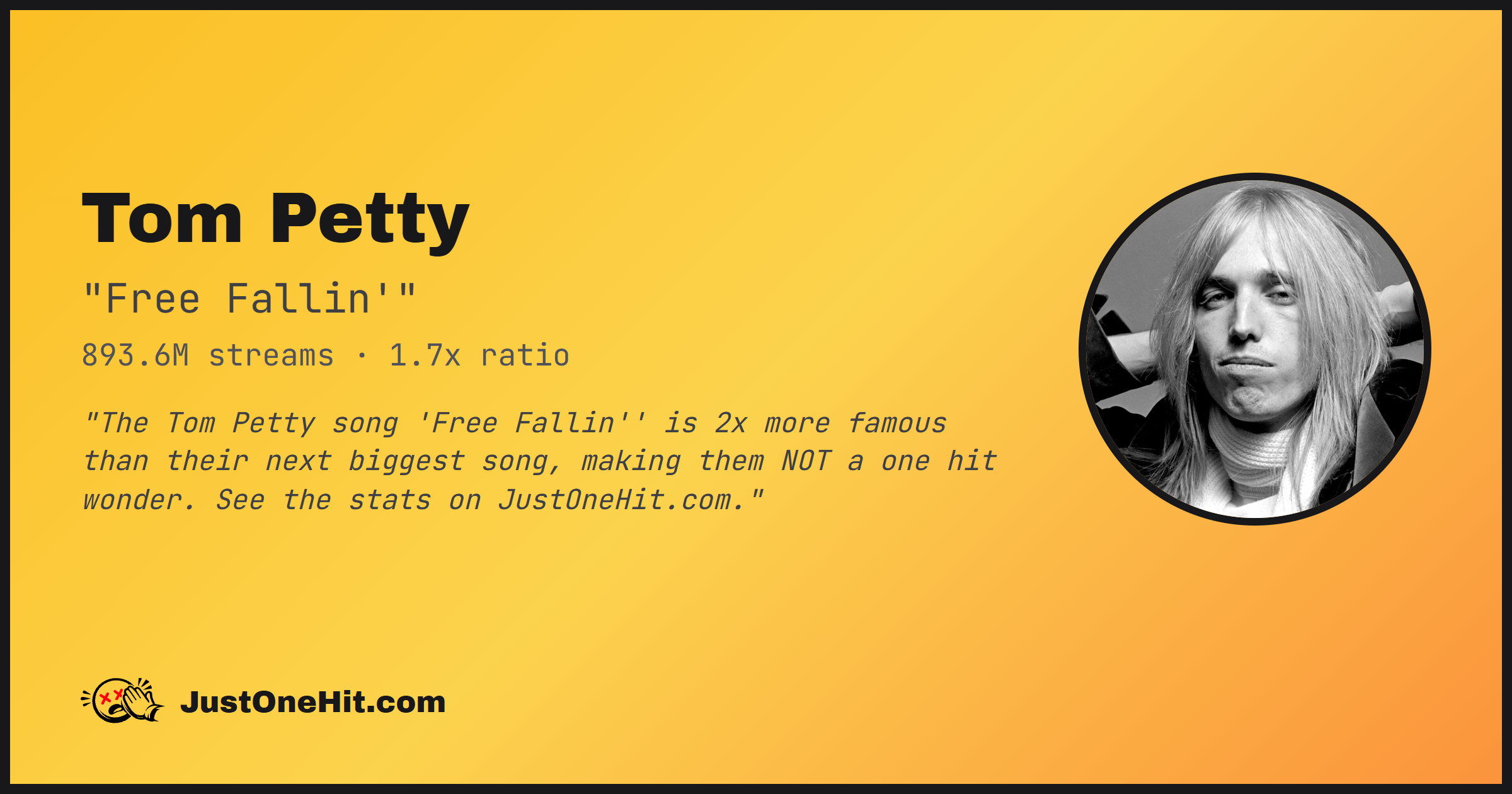 "The Tom Petty song 'Free Fallin'' is 2x more famous than their next biggest song, making them NOT a one hit wonder. See the stats on JustOneHit.com."