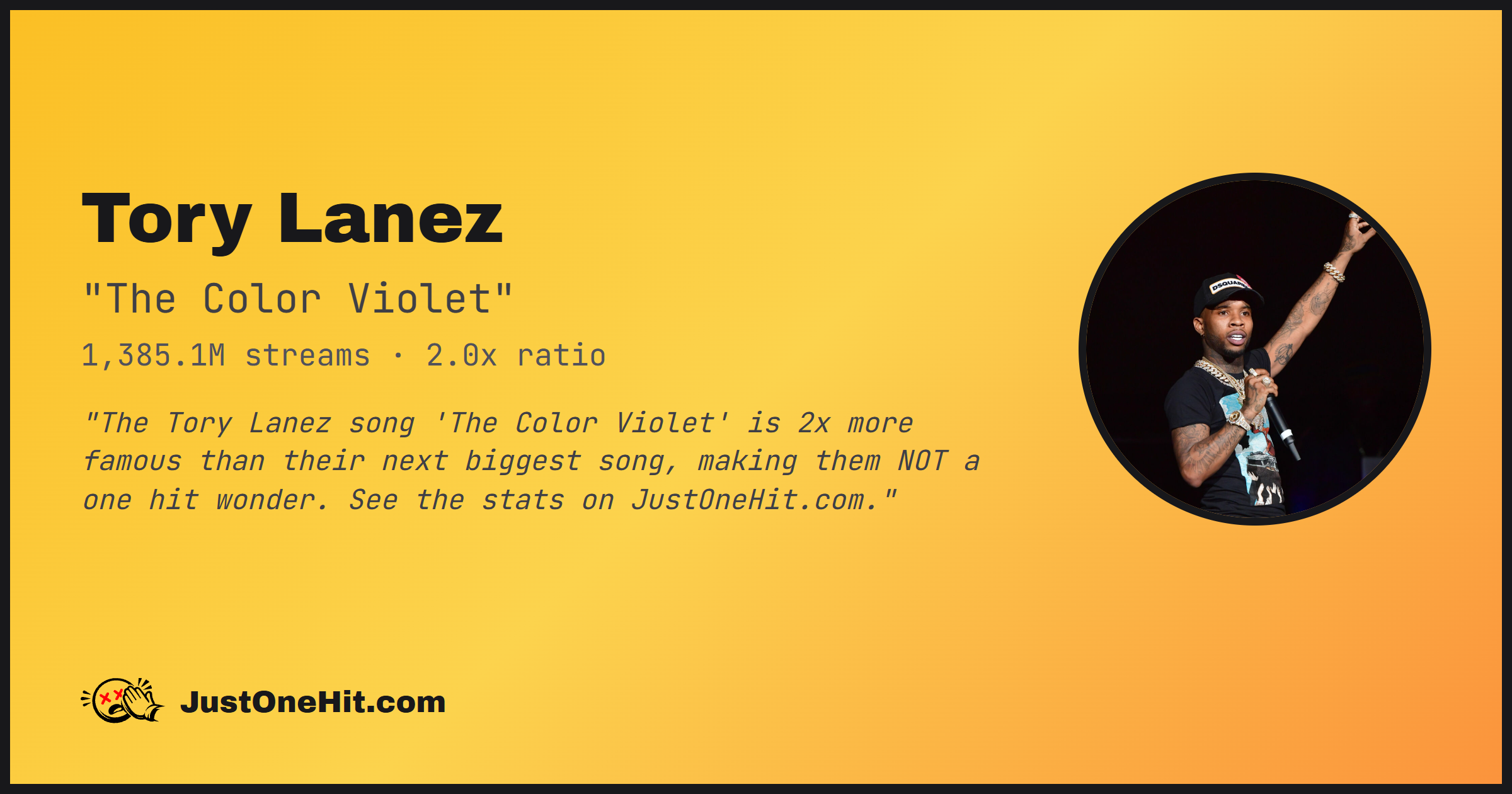"The Tory Lanez song 'The Color Violet' is 2x more famous than their next biggest song, making them NOT a one hit wonder. See the stats on JustOneHit.com."