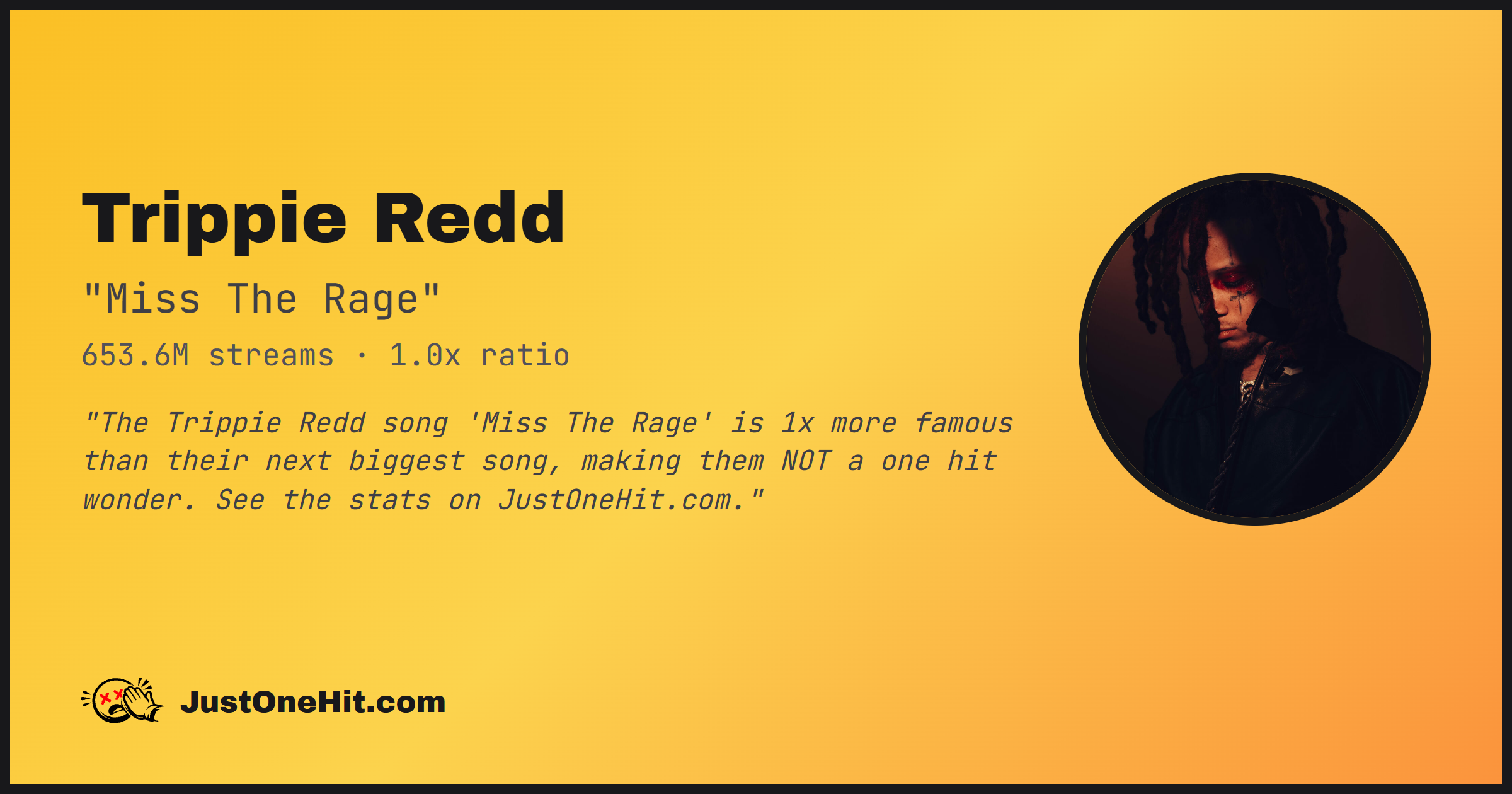 "The Trippie Redd song 'Miss The Rage' is 1x more famous than their next biggest song, making them NOT a one hit wonder. See the stats on JustOneHit.com."