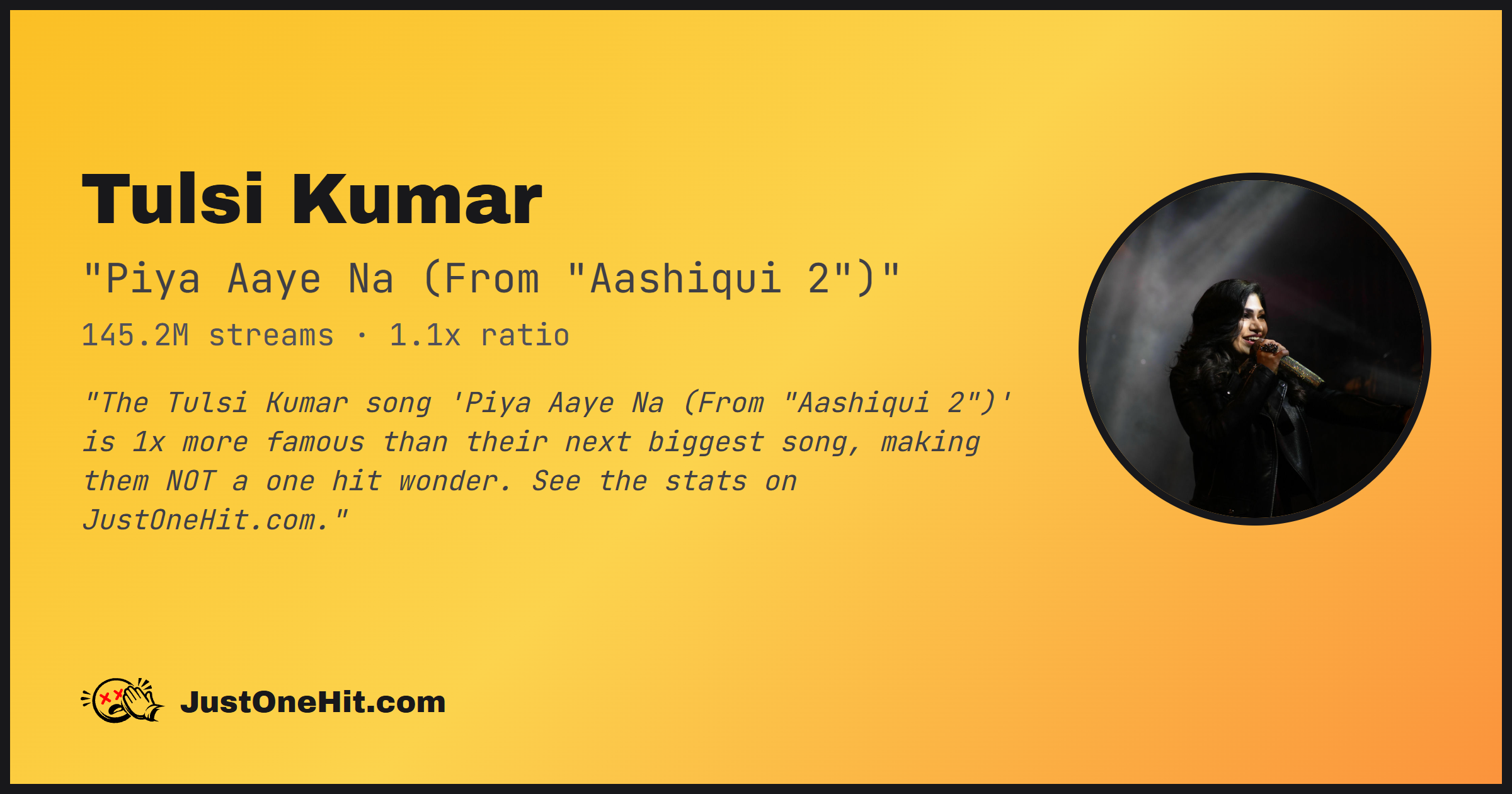 "The Tulsi Kumar song 'Piya Aaye Na (From "Aashiqui 2")' is 1x more famous than their next biggest song, making them NOT a one hit wonder. See the stats on JustOneHit.com."