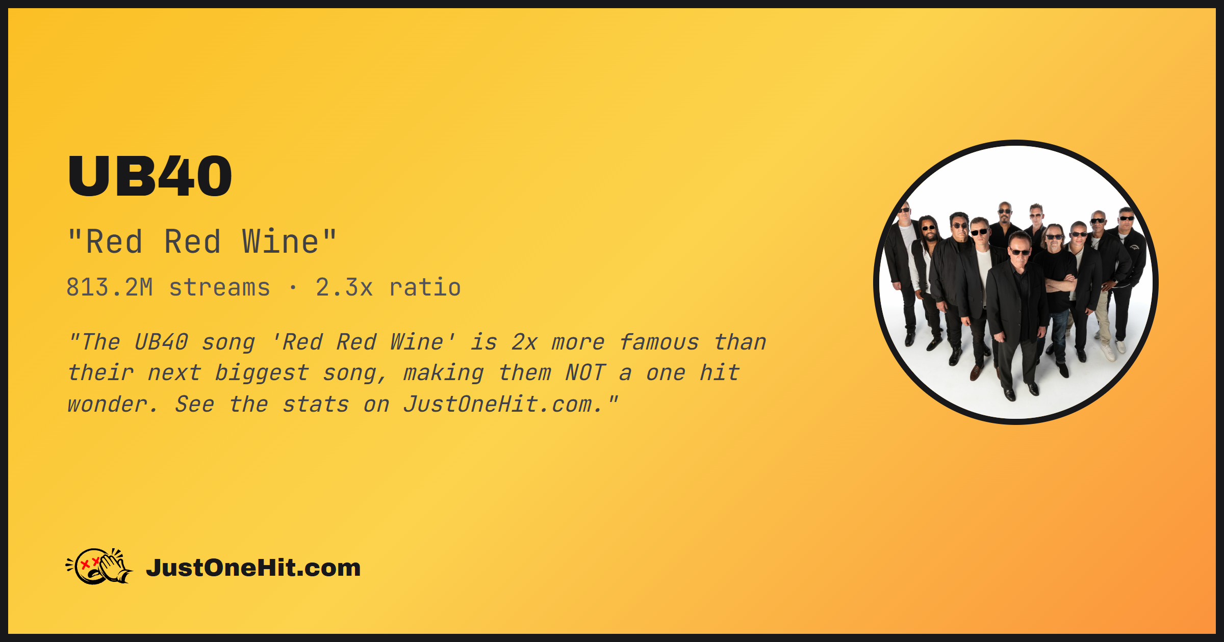 "The UB40 song 'Red Red Wine' is 2x more famous than their next biggest song, making them NOT a one hit wonder. See the stats on JustOneHit.com."