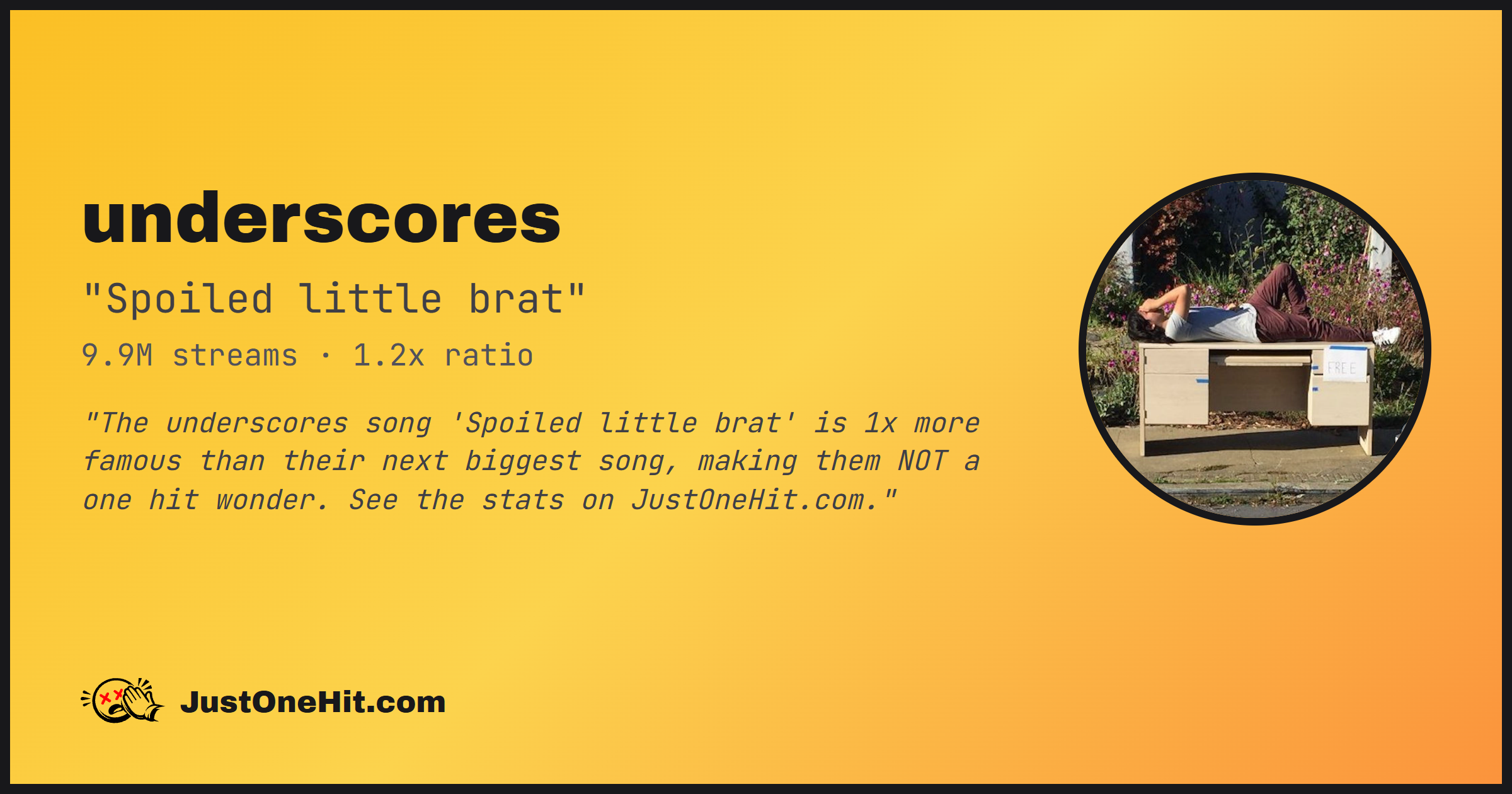 "The underscores song 'Spoiled little brat' is 1x more famous than their next biggest song, making them NOT a one hit wonder. See the stats on JustOneHit.com."