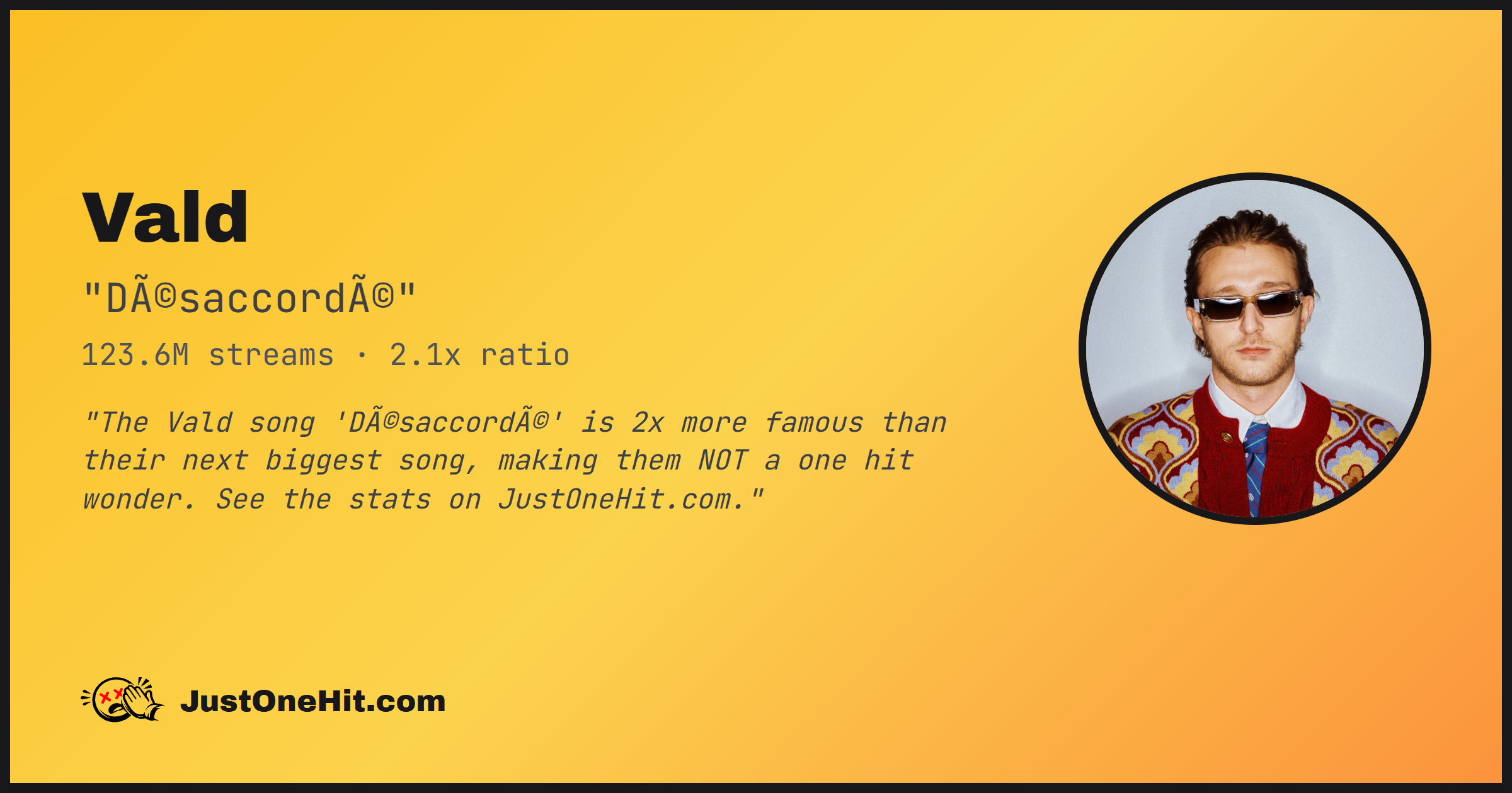 "The Vald song 'Désaccordé' is 2x more famous than their next biggest song, making them NOT a one hit wonder. See the stats on JustOneHit.com."