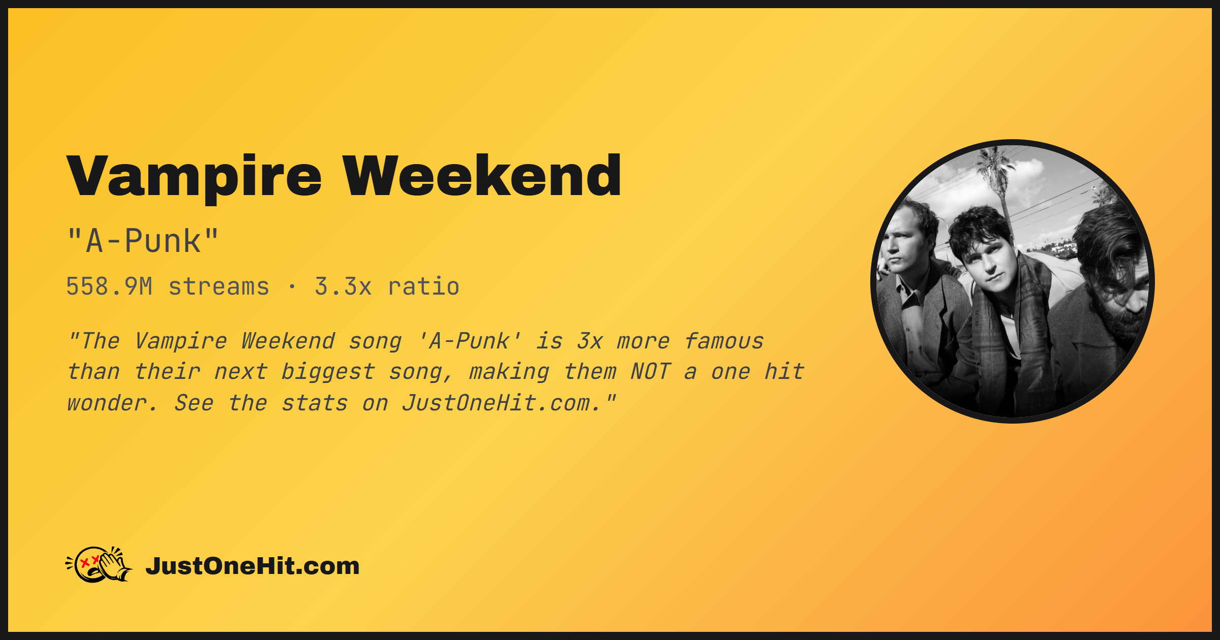 "The Vampire Weekend song 'A-Punk' is 3x more famous than their next biggest song, making them NOT a one hit wonder. See the stats on JustOneHit.com."