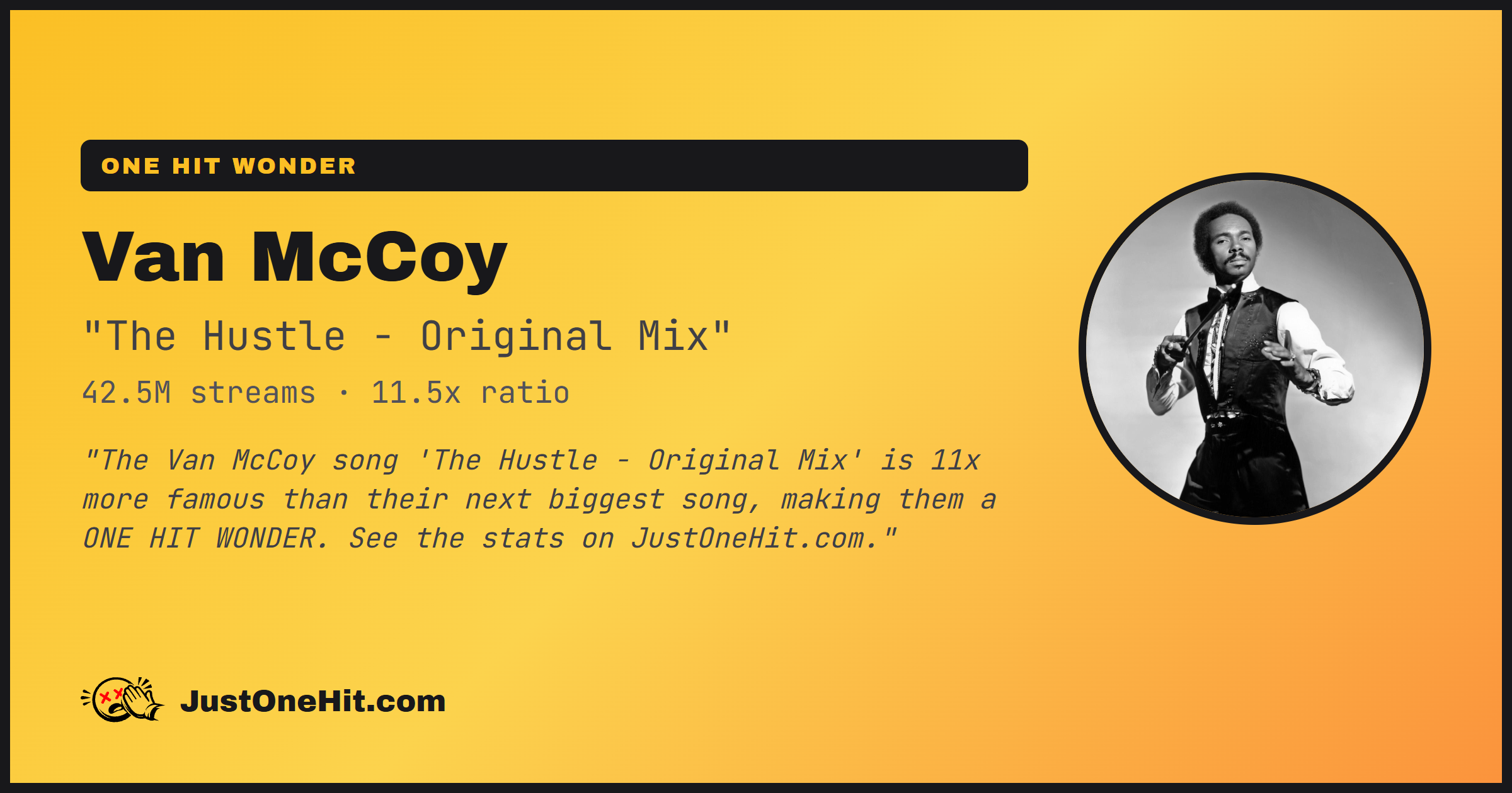 "The Van McCoy song 'The Hustle - Original Mix' is 12x more famous than their next biggest song, making them a ONE HIT WONDER. See the stats on JustOneHit.com."