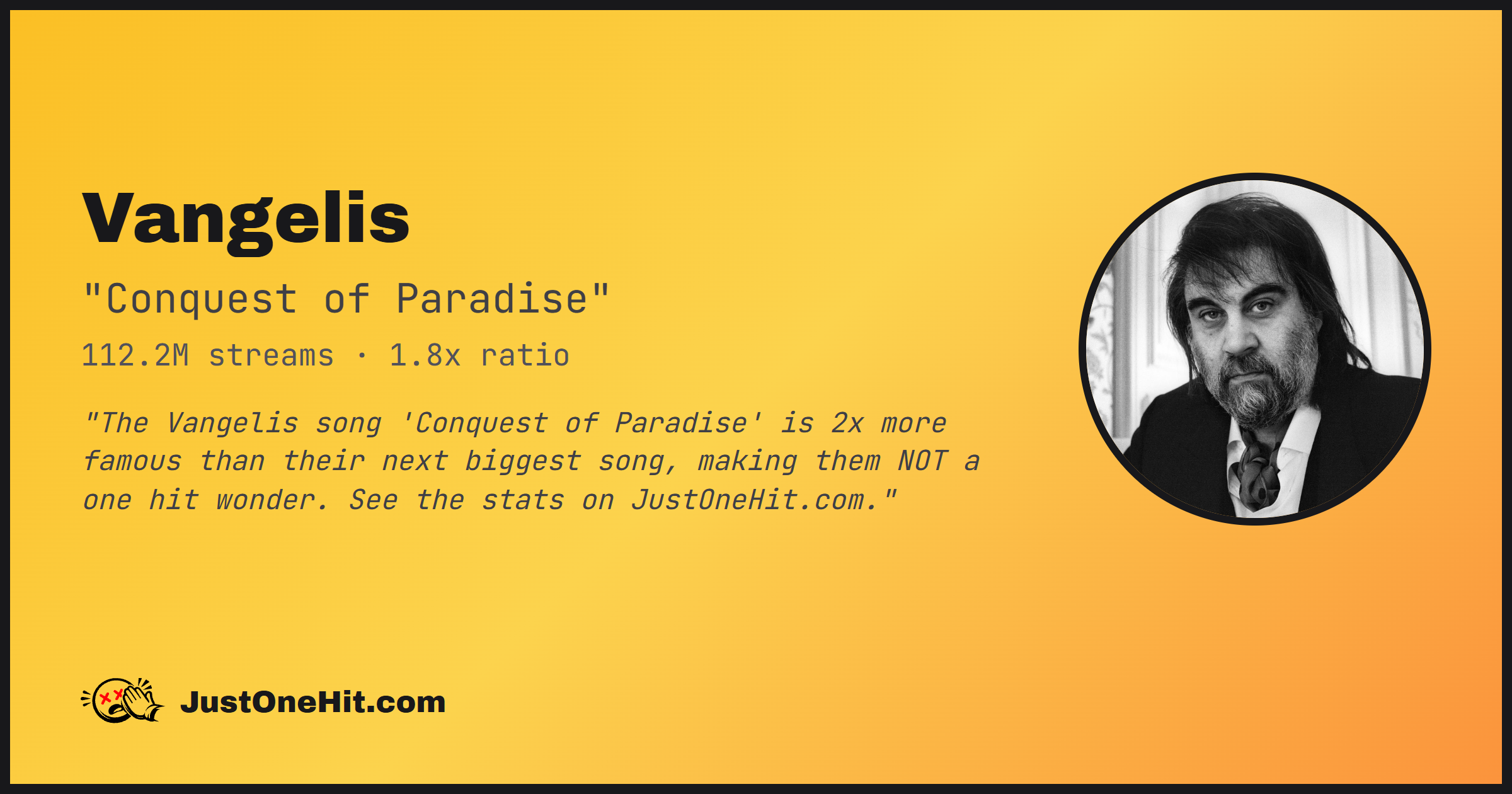 "The Vangelis song 'Conquest of Paradise' is 2x more famous than their next biggest song, making them NOT a one hit wonder. See the stats on JustOneHit.com."