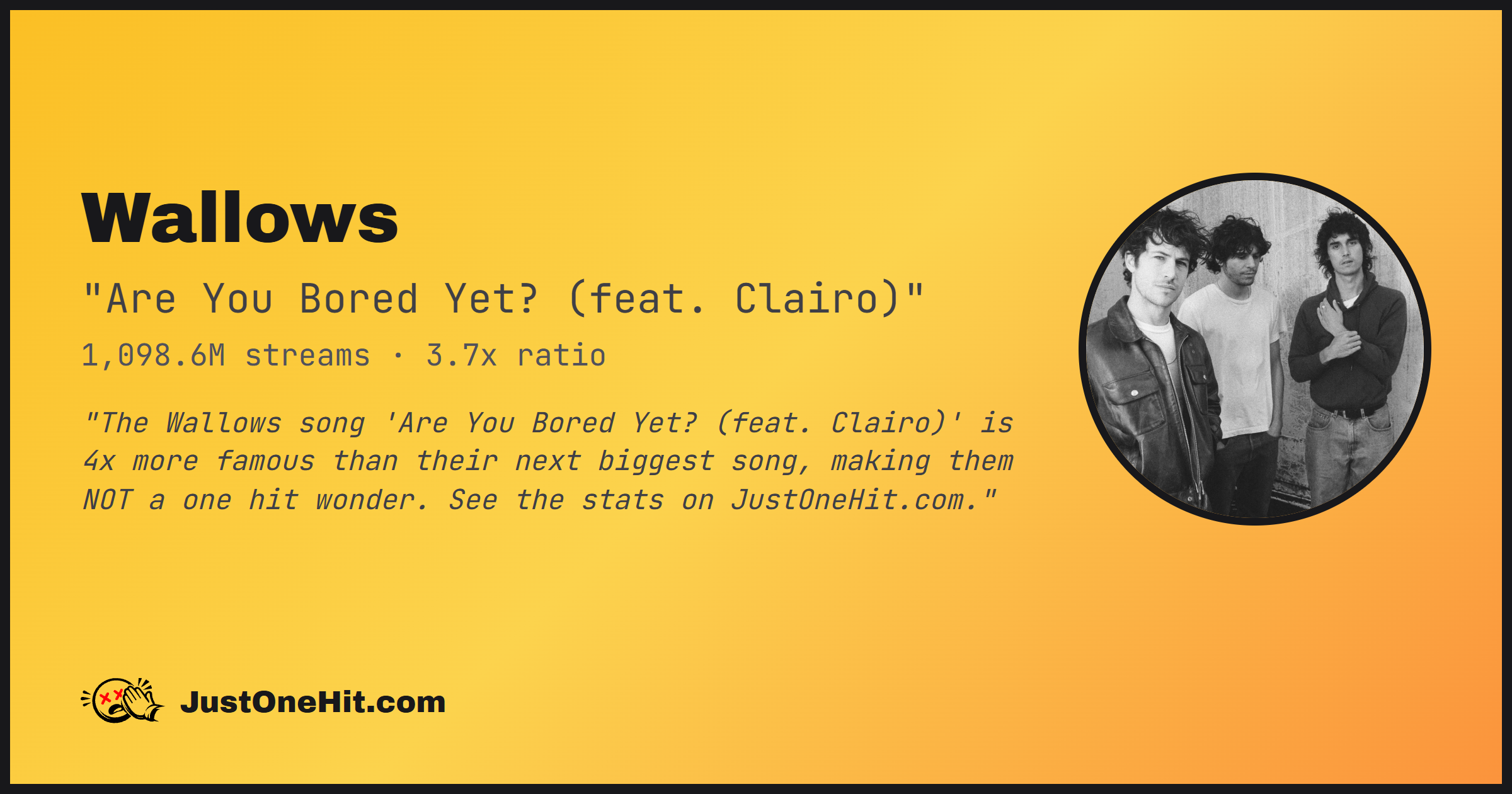 "The Wallows song 'Are You Bored Yet? (feat. Clairo)' is 4x more famous than their next biggest song, making them NOT a one hit wonder. See the stats on JustOneHit.com."