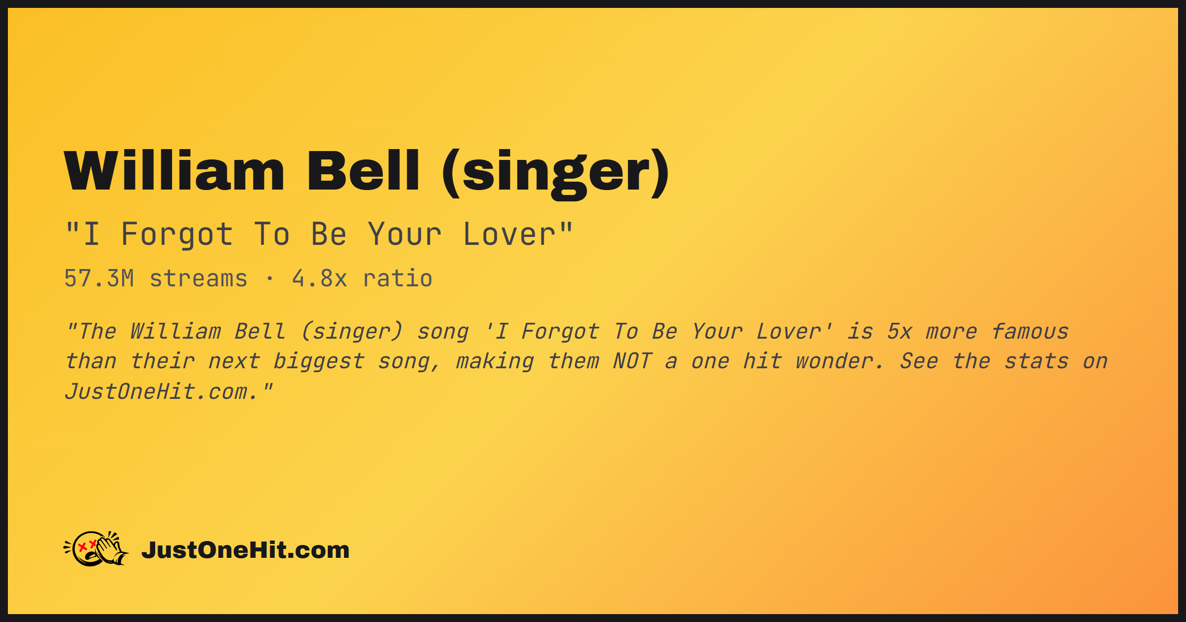 "The William Bell (singer) song 'I Forgot To Be Your Lover' is 5x more famous than their next biggest song, making them NOT a one hit wonder. See the stats on JustOneHit.com."