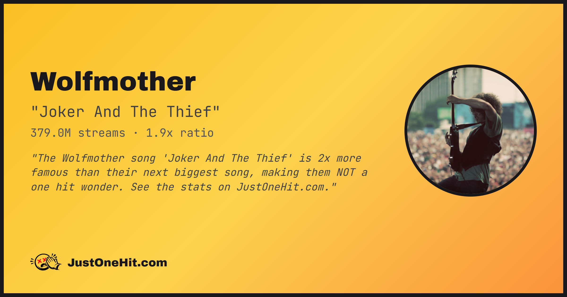 "The Wolfmother song 'Joker And The Thief' is 2x more famous than their next biggest song, making them NOT a one hit wonder. See the stats on JustOneHit.com."