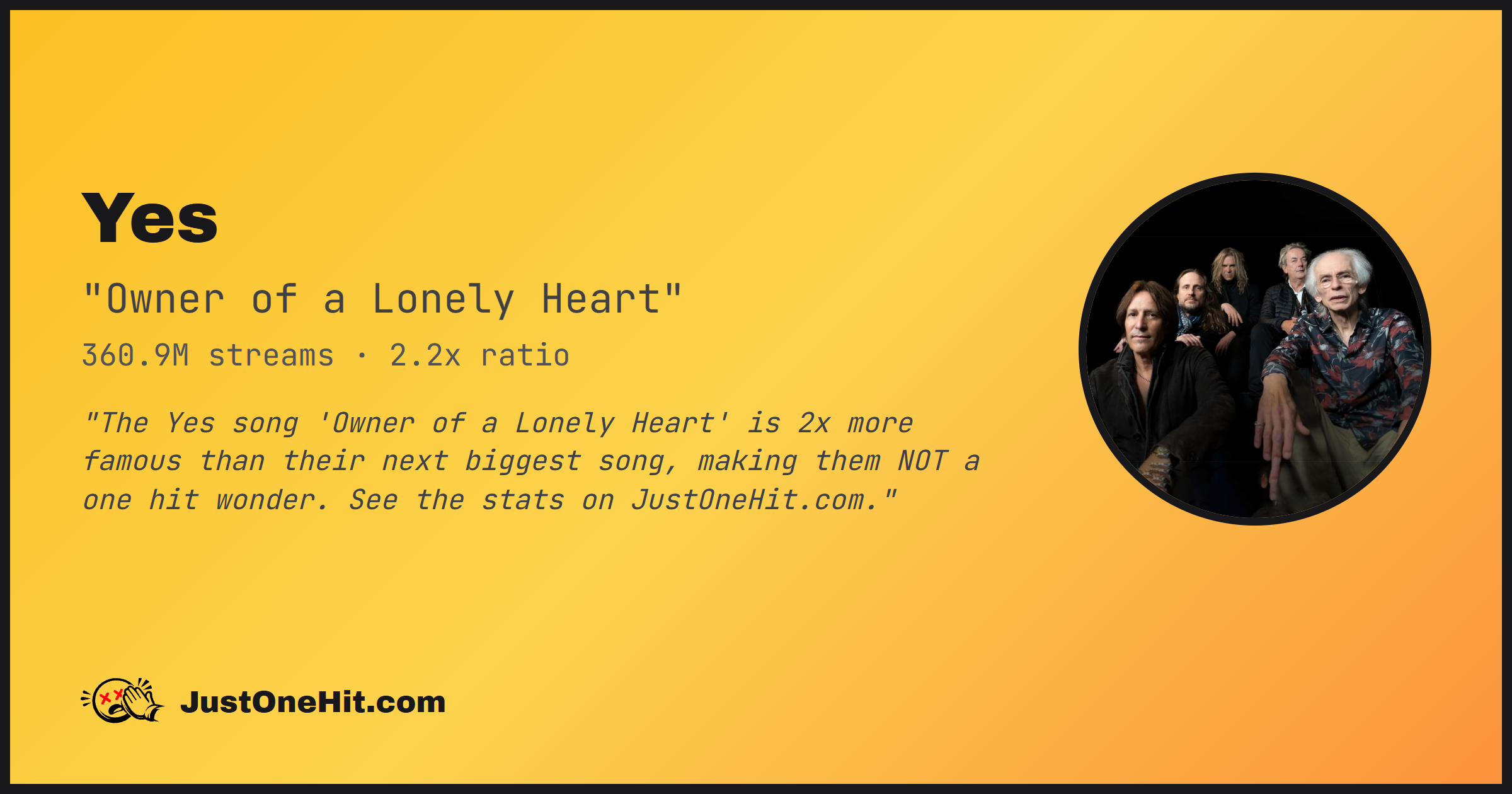"The Yes song 'Owner of a Lonely Heart' is 2x more famous than their next biggest song, making them NOT a one hit wonder. See the stats on JustOneHit.com."