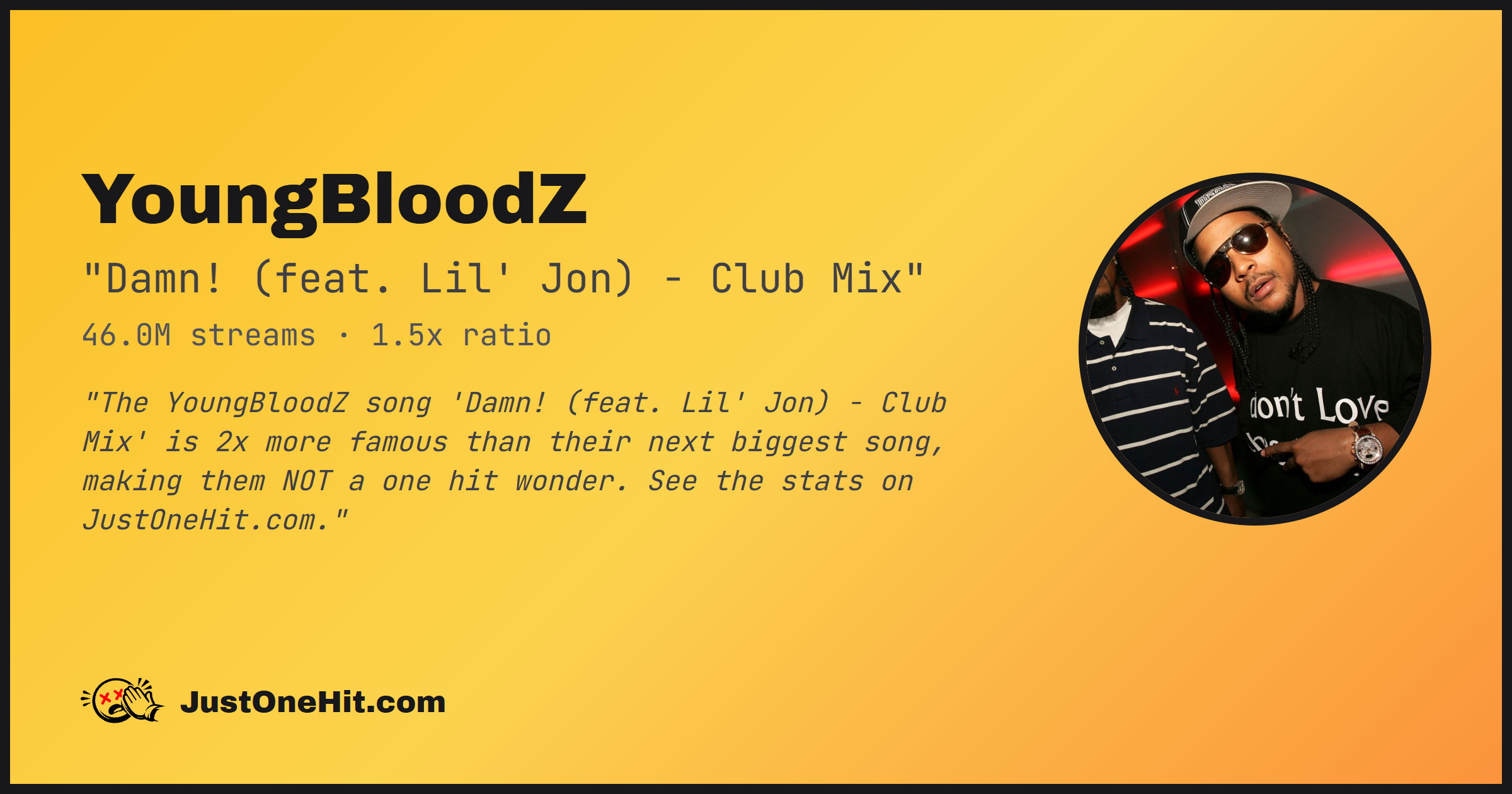 "The YoungBloodZ song 'Damn! (feat. Lil' Jon) - Club Mix' is 2x more famous than their next biggest song, making them NOT a one hit wonder. See the stats on JustOneHit.com."