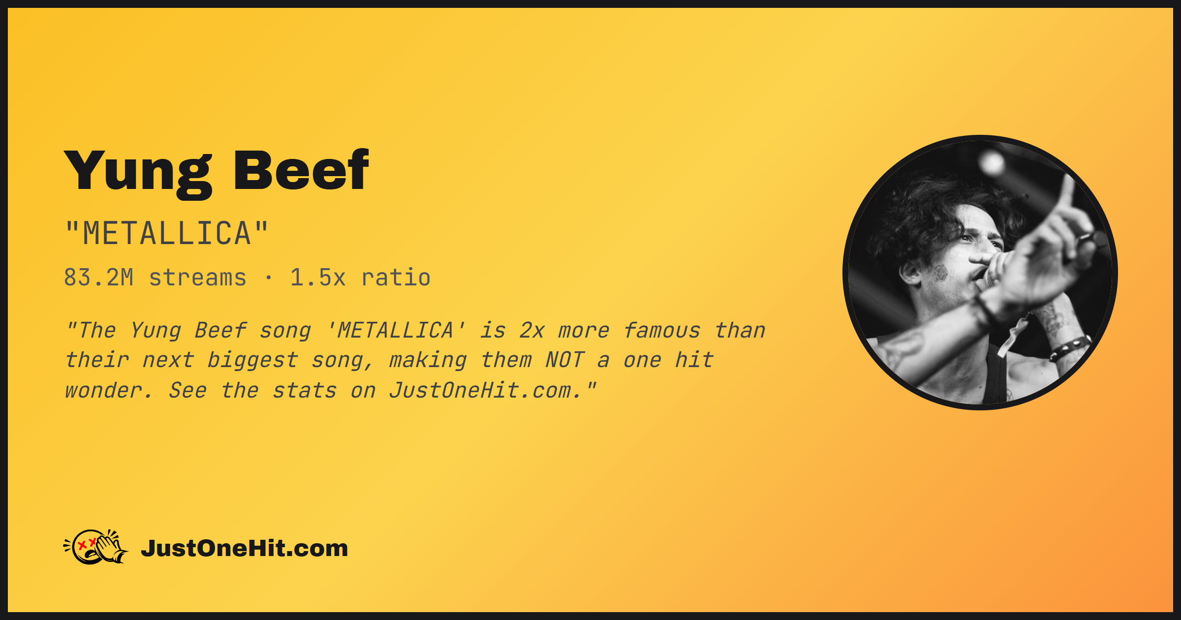 "The Yung Beef song 'METALLICA' is 2x more famous than their next biggest song, making them NOT a one hit wonder. See the stats on JustOneHit.com."