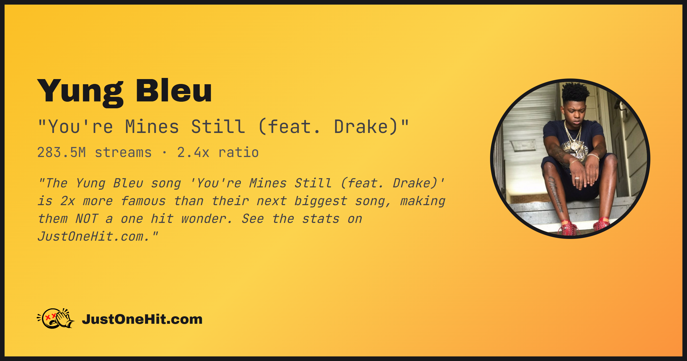 "The Yung Bleu song 'You're Mines Still (feat. Drake)' is 2x more famous than their next biggest song, making them NOT a one hit wonder. See the stats on JustOneHit.com."
