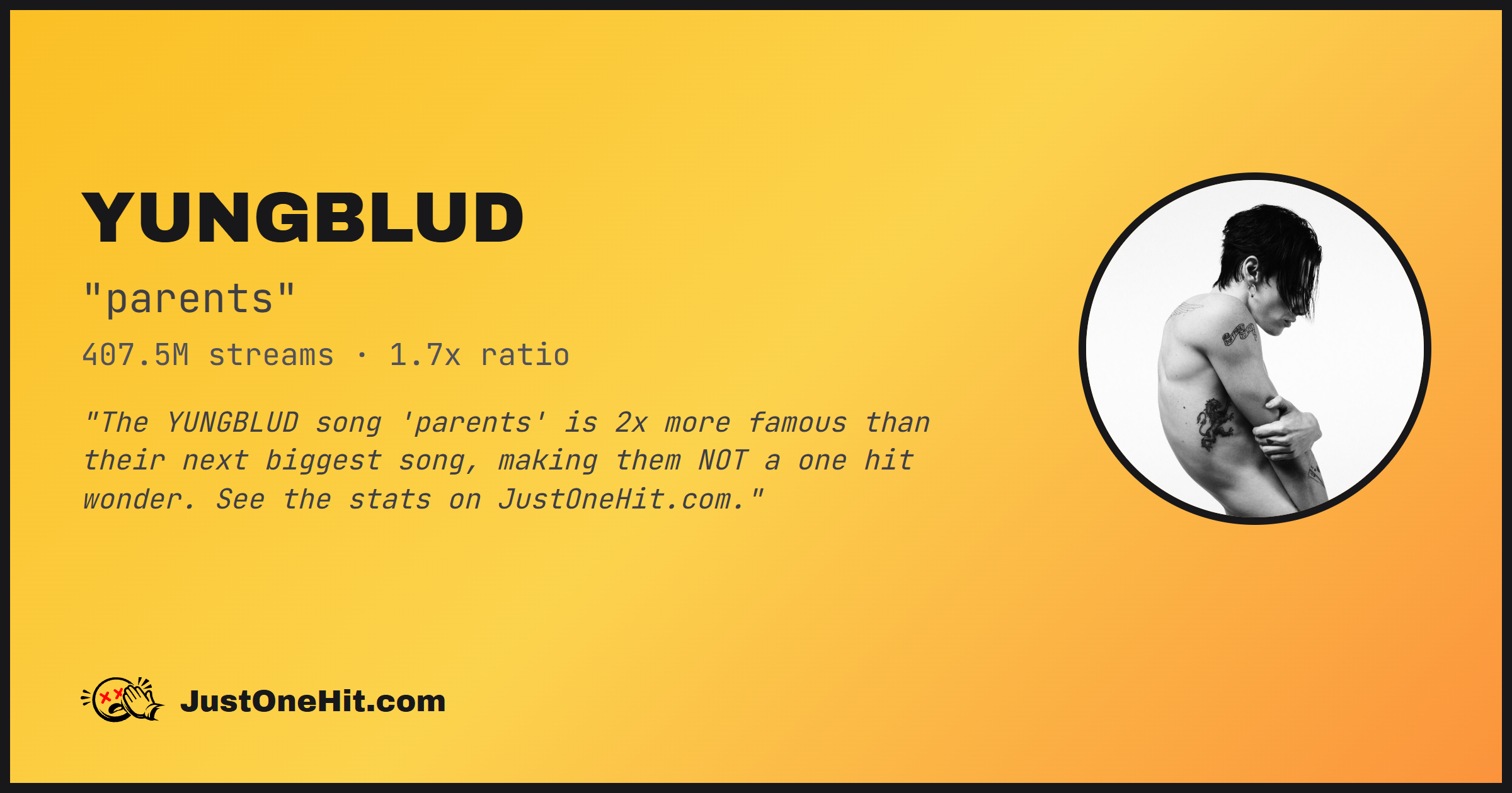 "The YUNGBLUD song 'parents' is 2x more famous than their next biggest song, making them NOT a one hit wonder. See the stats on JustOneHit.com."