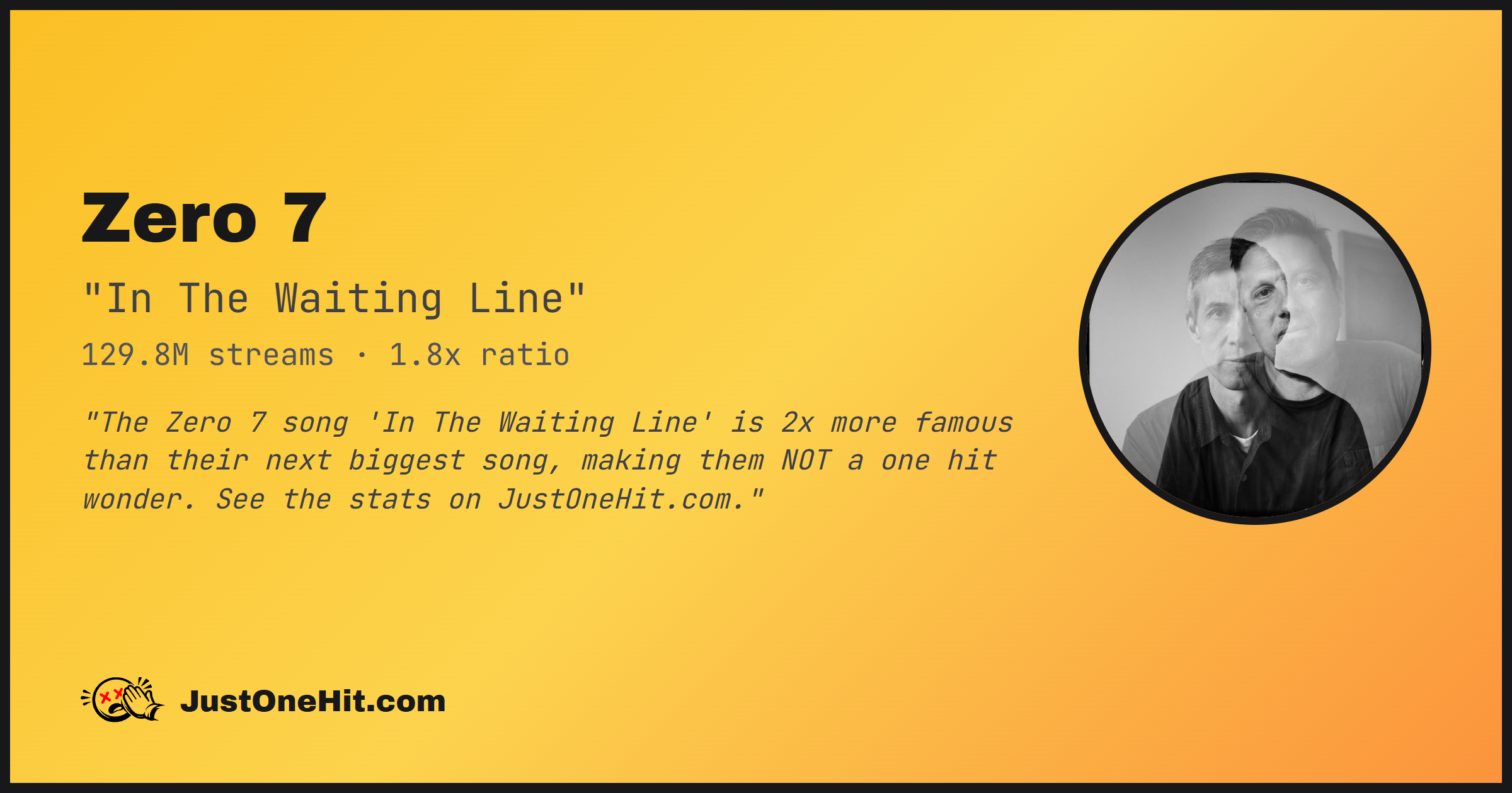 "The Zero 7 song 'In The Waiting Line' is 2x more famous than their next biggest song, making them NOT a one hit wonder. See the stats on JustOneHit.com."
