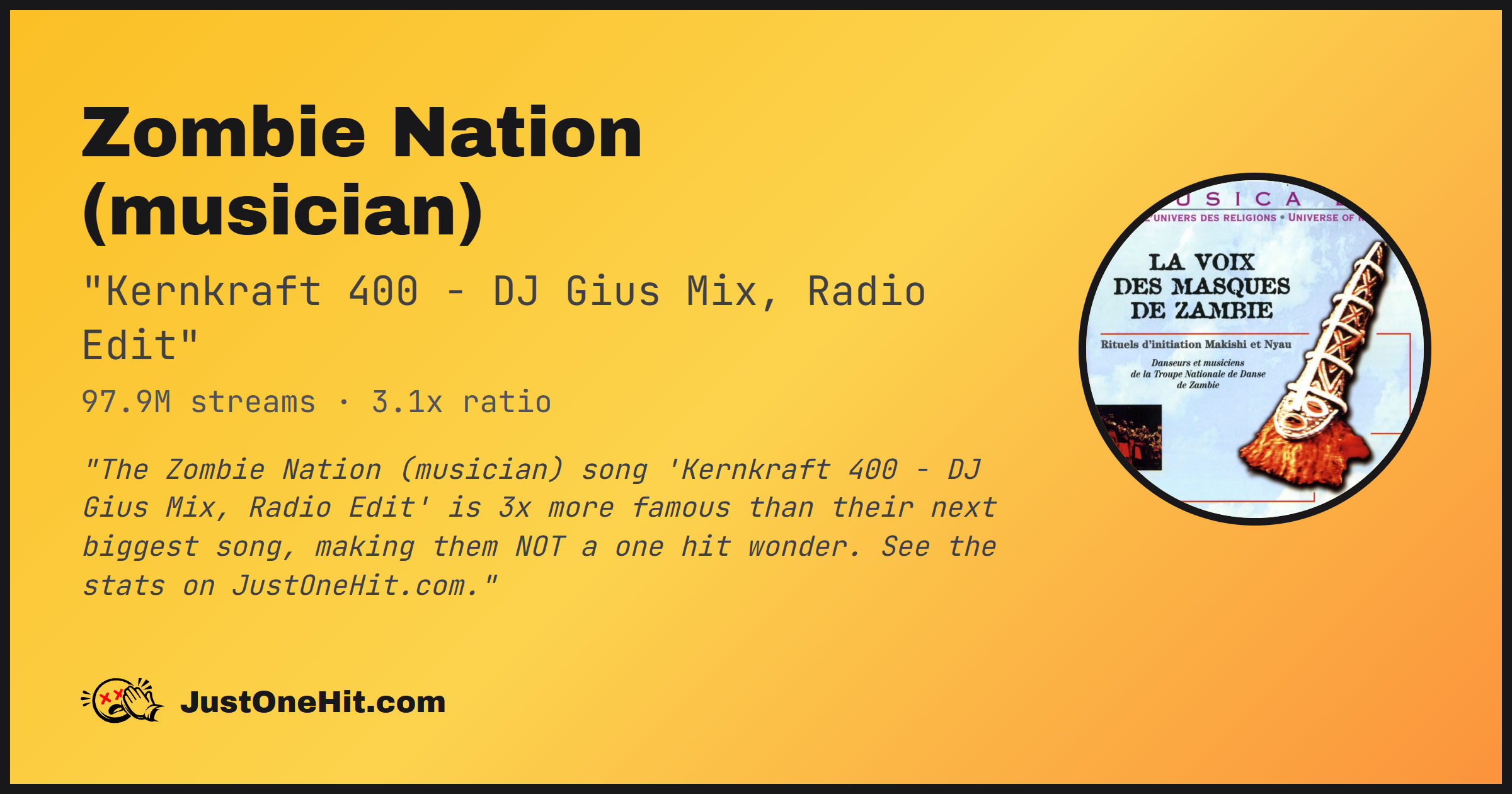 "The Zombie Nation (musician) song 'Kernkraft 400 - DJ Gius Mix, Radio Edit' is 3x more famous than their next biggest song, making them NOT a one hit wonder. See the stats on JustOneHit.com."