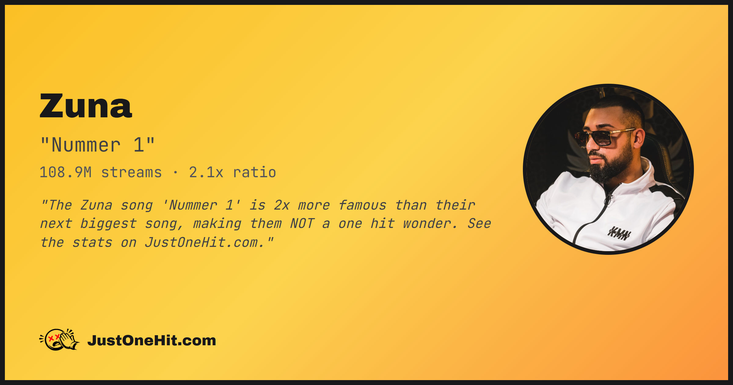 "The Zuna song 'Nummer 1' is 2x more famous than their next biggest song, making them NOT a one hit wonder. See the stats on JustOneHit.com."
